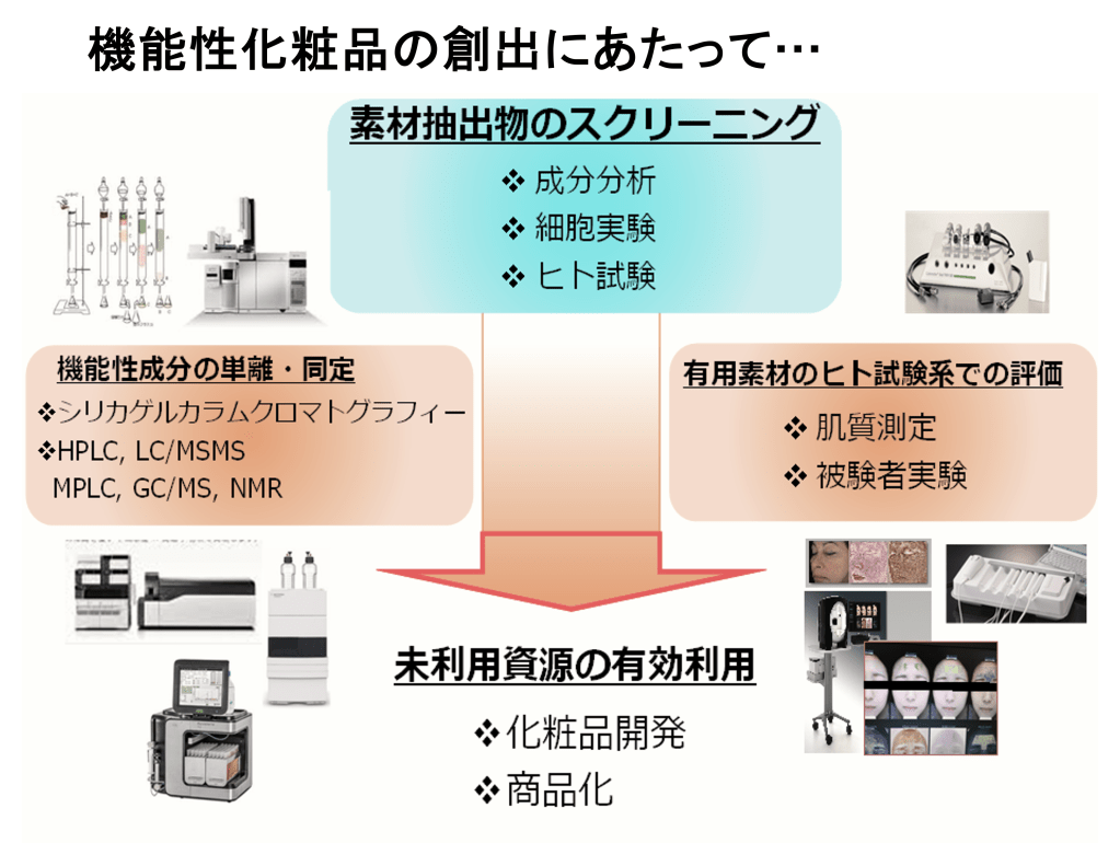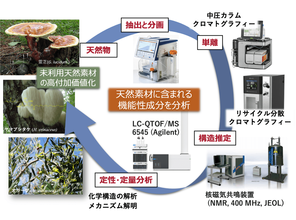 各種クロマトグラフィーを用いた機能成分の単離同定やLC-QTOFMSを用いたメタボロミクス解析、植物の香りの人試験、抽出された成分の機能解明(細胞等を用いた機能性評価)なども実施可能です。